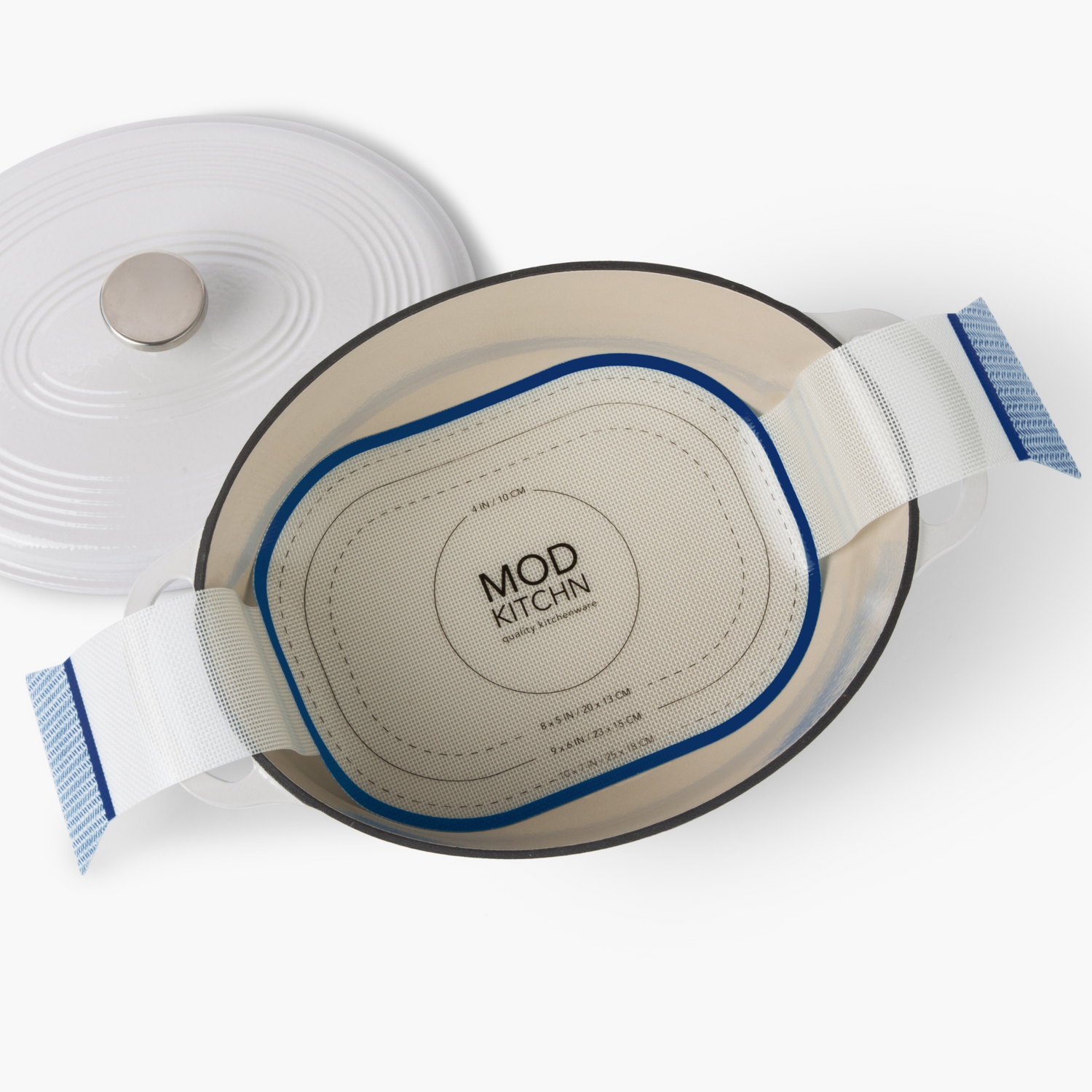 I bake a lot of sourdough loaves each week. Most are a batard shape, so I was excited to see this large oval shaped bread sling. The others I have seen are smaller so not big enough to fully protect my loaves. I like not having to waste parchment paper even though I do use them as long as possible. In addition, using a silicone sling with handles does make for a safer transfer to the Dutch oven compared to using a sheet of parchment. The other advantage is that the bottom of the loaf didn’t get hard or burnt, as often happens in a Dutch oven. It perfectly fits my 12-inch oval Dutch oven.After you remove the pot from the oven, be aware that the silicone mat will be hot as well so keep your oven gloves on while you remove the sling. Or just simply remove the loaf, to place on a cooling rack and leave the sling in the pan to cool.I like that these slings were shipped in a protective seal. They look and feel like my best silicone cooking mats. A great feature is the wide ends of the handles, creating a more comfortable and secure grip. Thoughtfully included is a band to hold the rolled-up sling, making it easy to store in a drawer. The band is similar to the slap bracelets that all the kids love. I’m going to get a round sling too, as I do occasionally also bake round loaves in a round Dutch oven – often at the same time I am baking an oval loaf.
